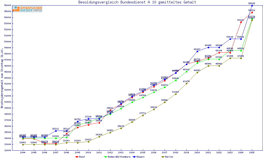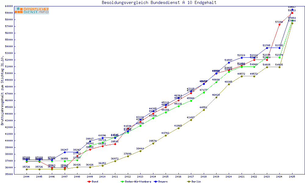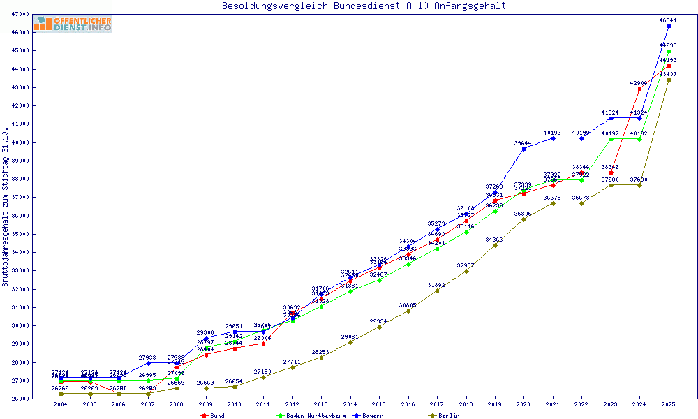 | Besoldungsvergleich A 10 im Jahr 2025 | Anfangsgehalt | ||||||