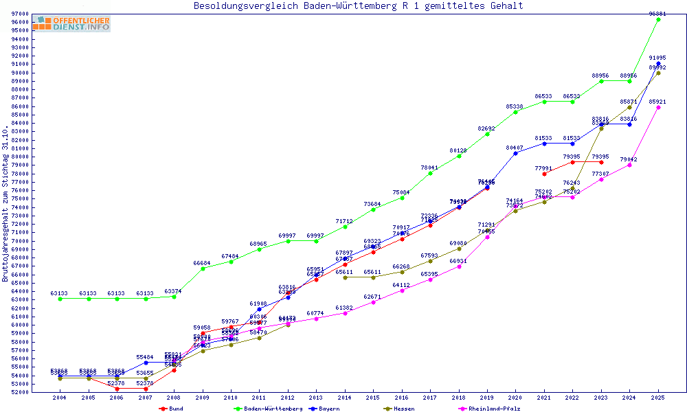 | Besoldungsvergleich R 1 im Jahr 2025 | gemitteltes Gehalt | ||||||