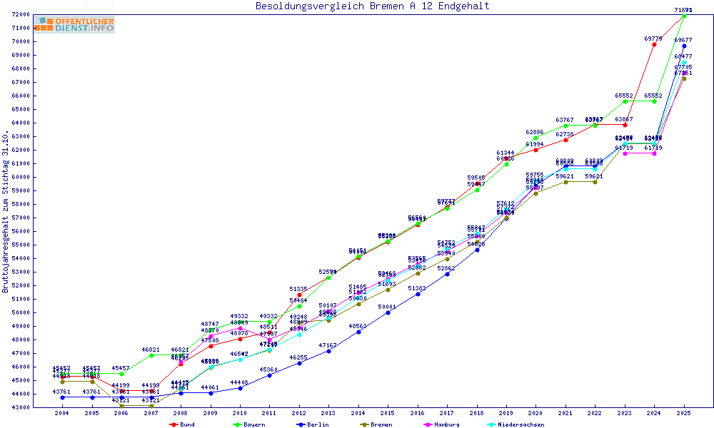 | Bayern | 71.892 € | +4640 € | +6.9% | +2614 € | +3.8% | 24 Jahre | ||