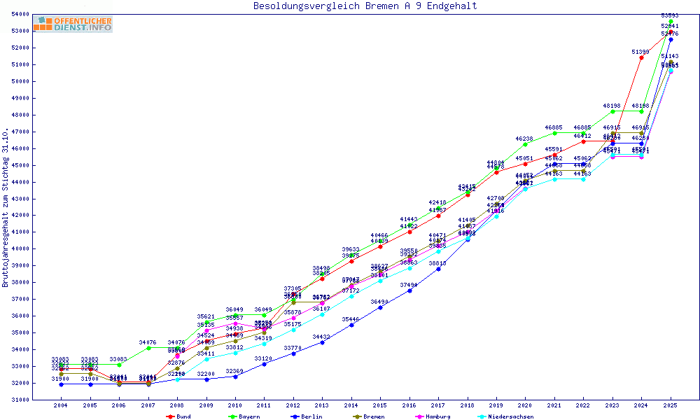 | Bayern | 53.594 € | +2450 € | +4.8% | +2054 € | +4.0% | 24 Jahre | ||