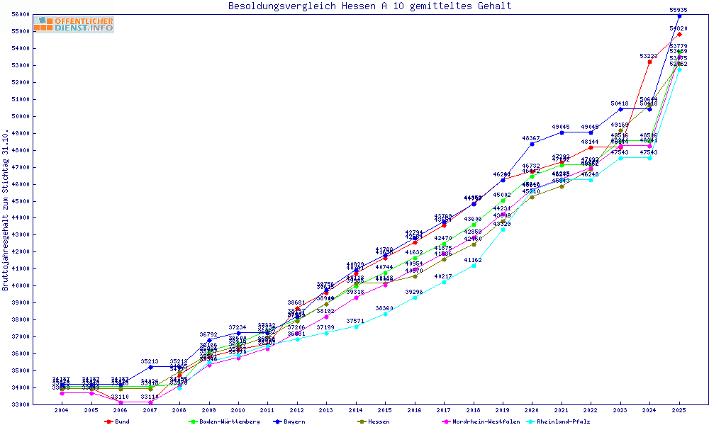 | Besoldungsvergleich A 10 im Jahr 2025 | gemitteltes Gehalt | ||||||