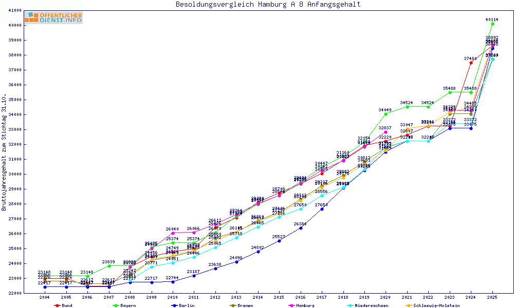 | Besoldungsvergleich A 8 im Jahr 2025 | Anfangsgehalt | ||||||