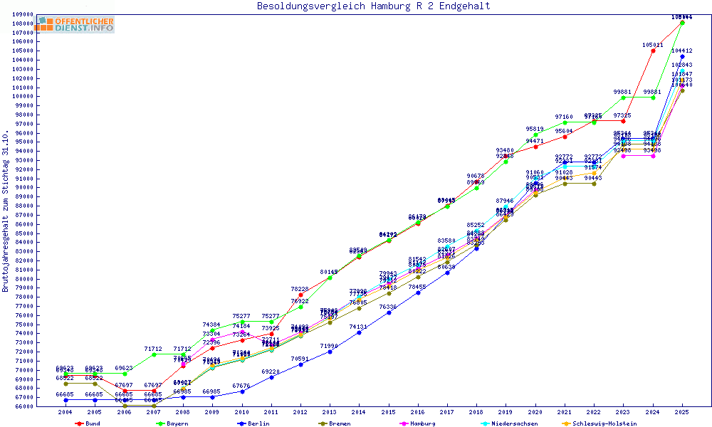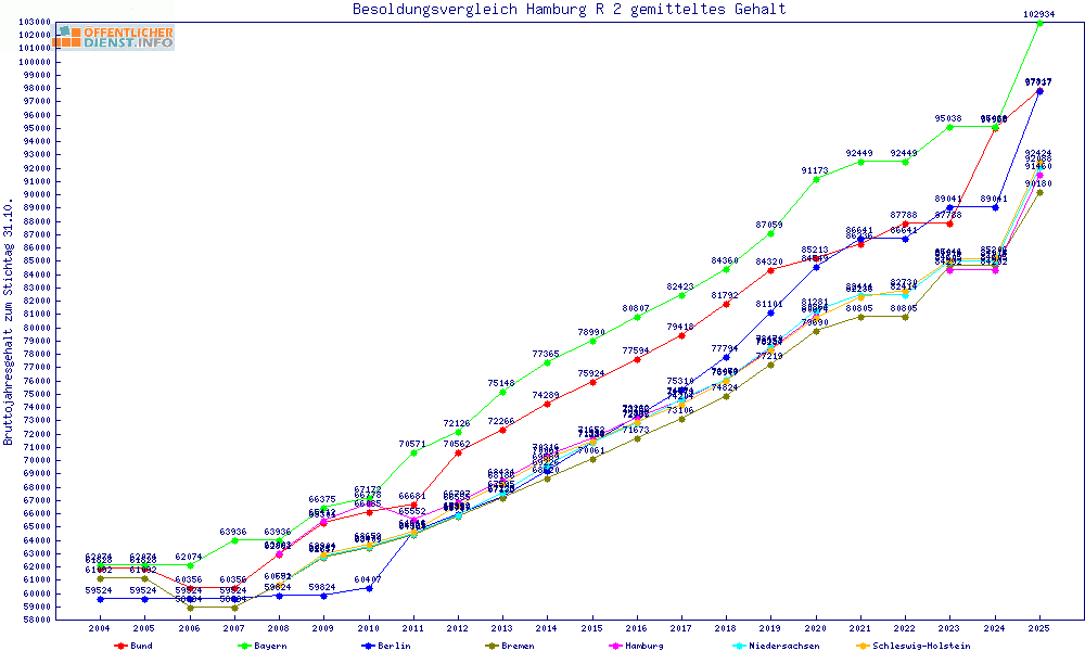 | Besoldungsvergleich R 2 im Jahr 2025 | gemitteltes Gehalt | ||||||