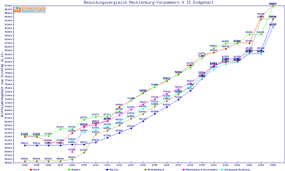 | Bund | 96.981 € | +5523 € | +6.0% | +3450 € | +3.7% | 23 Jahre | ||