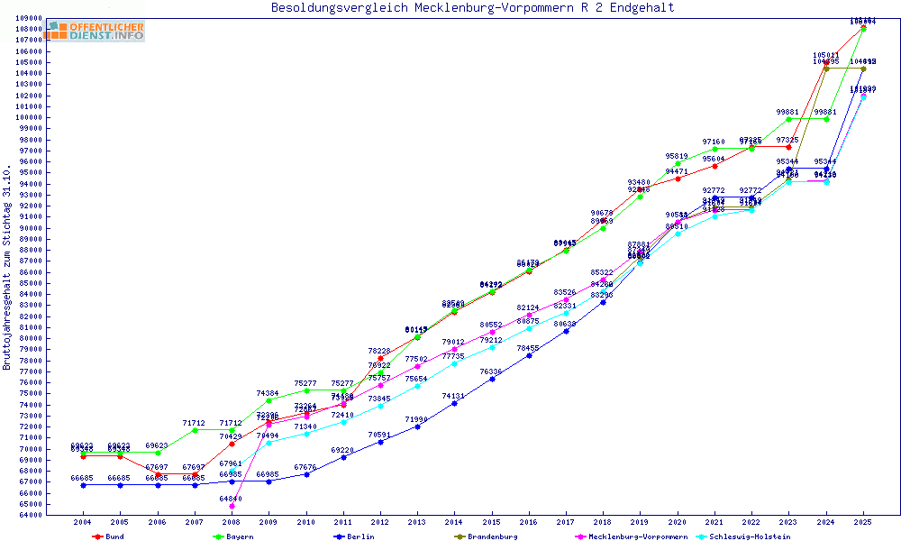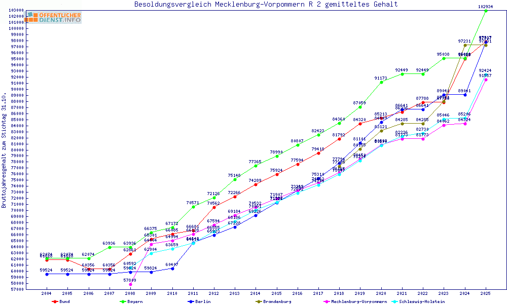 | Besoldungsvergleich R 2 im Jahr 2025 | gemitteltes Gehalt | ||||||