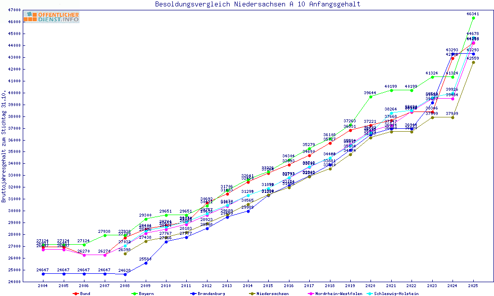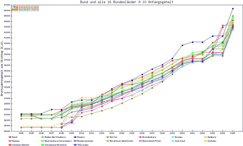 | Besoldungsvergleich A 10 im Jahr 2025 | Anfangsgehalt | ||||||