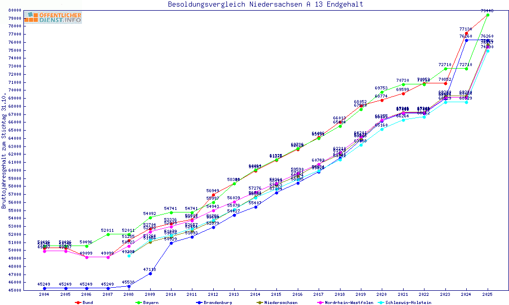 | Besoldungsvergleich A 13 im Jahr 2025 | Anfangsgehalt | ||||||
