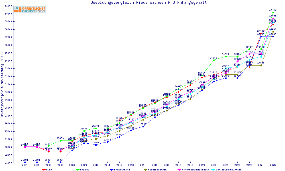 | Besoldungsvergleich A 8 im Jahr 2025 | Anfangsgehalt | ||||||