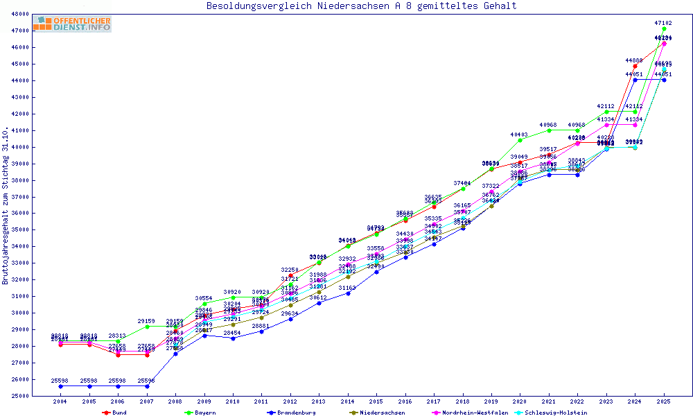 | Besoldungsvergleich A 8 im Jahr 2025 | gemitteltes Gehalt | ||||||