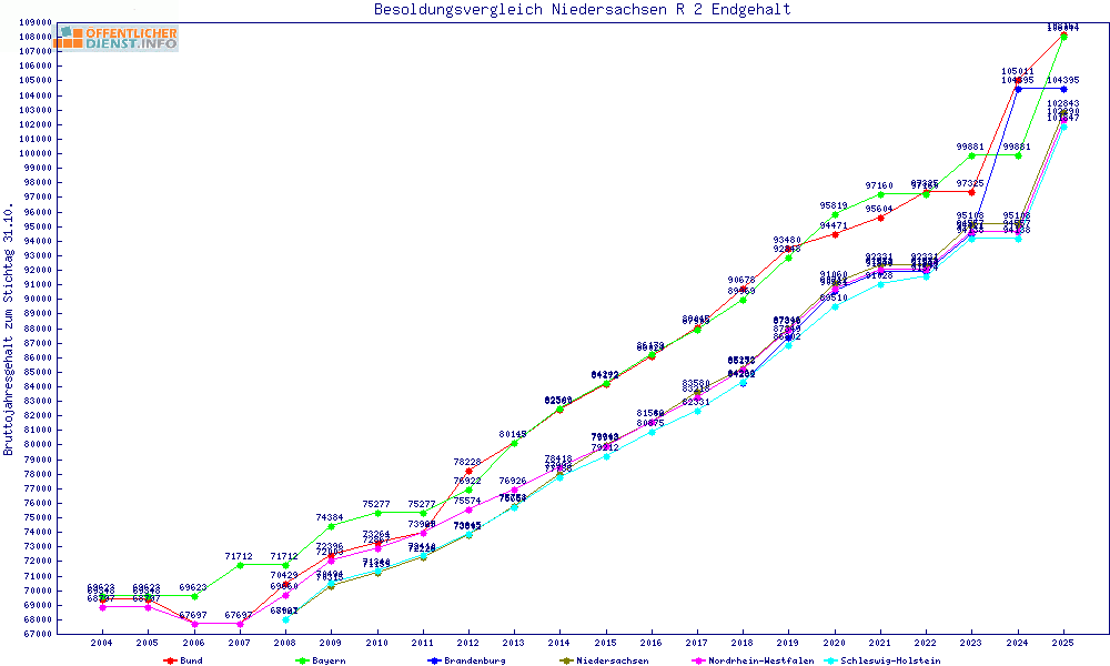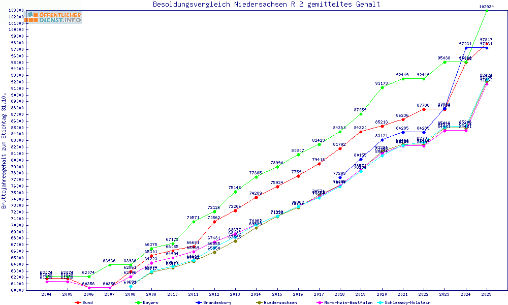 | Besoldungsvergleich R 2 im Jahr 2025 | gemitteltes Gehalt | ||||||
