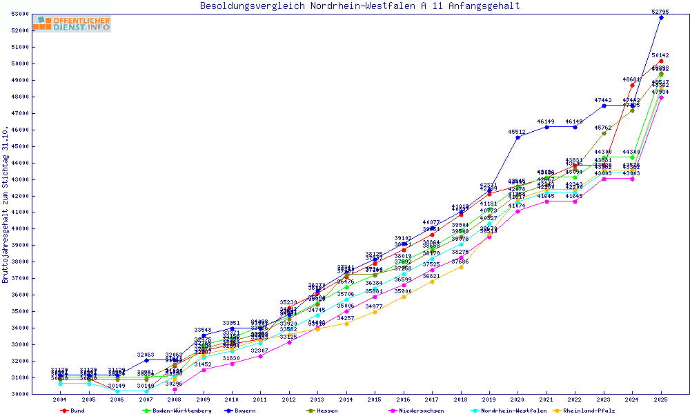 | Besoldungsvergleich A 11 im Jahr 2025 | Anfangsgehalt | ||||||