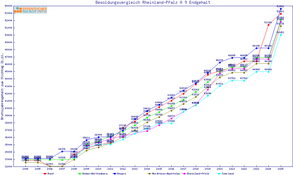 | Bayern | 53.594 € | +1737 € | +3.4% | +2054 € | +4.0% | 24 Jahre | ||