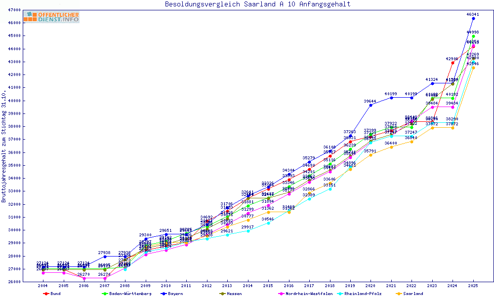 | Besoldungsvergleich A 10 im Jahr 2025 | Anfangsgehalt | ||||||