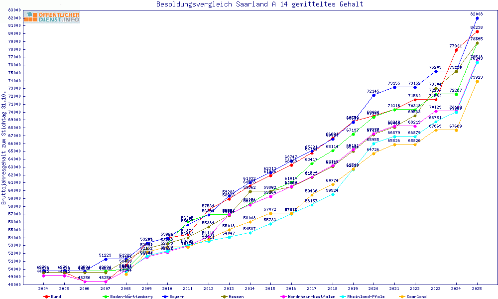 | Besoldungsvergleich A 14 im Jahr 2025 | gemitteltes Gehalt | ||||||