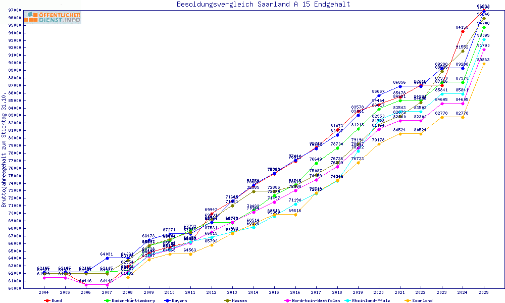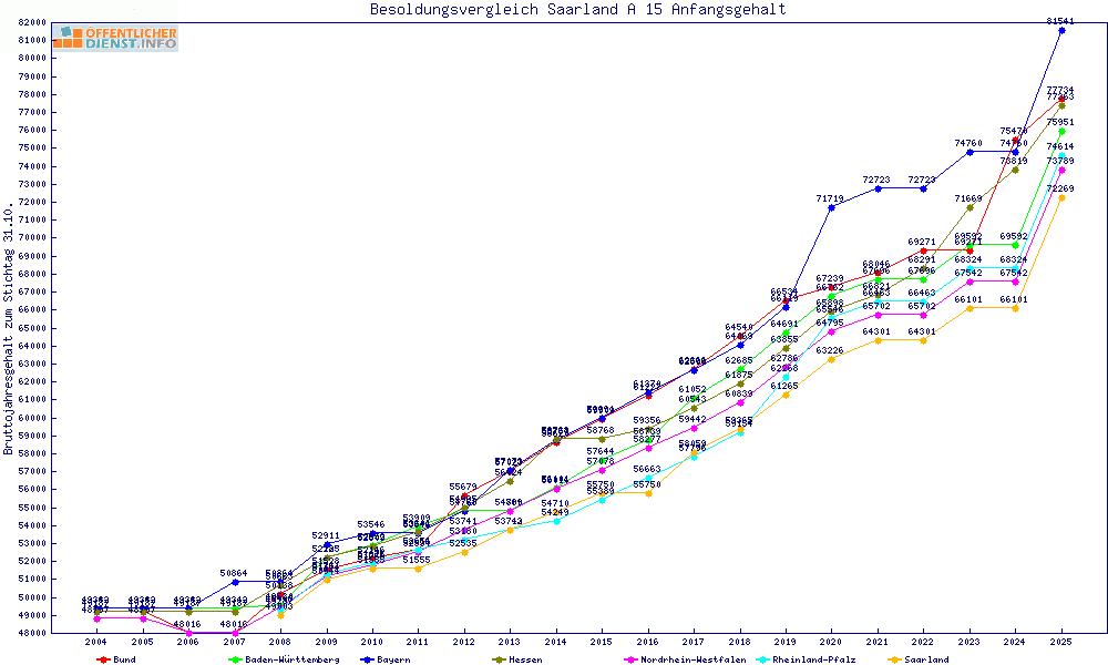 | Besoldungsvergleich A 15 im Jahr 2025 | Anfangsgehalt | ||||||