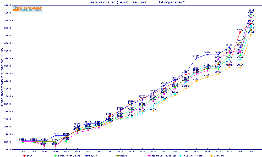 | Besoldungsvergleich A 8 im Jahr 2025 | Anfangsgehalt | ||||||