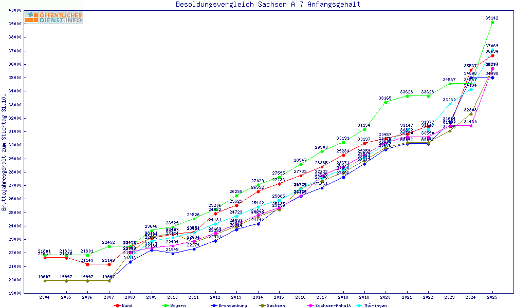 | Sachsen | 45.637 € | +1180 € | +2.7% | 24 Jahre | ||||