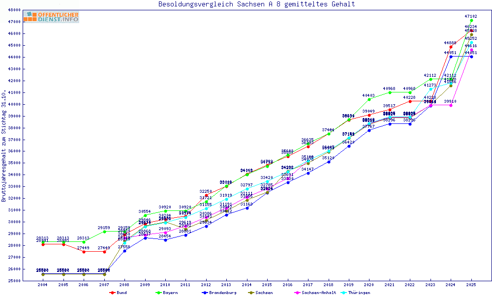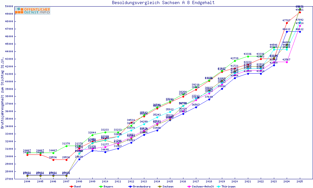| Sachsen | 49.603 € | +1569 € | +3.3% | 26 Jahre | ||||