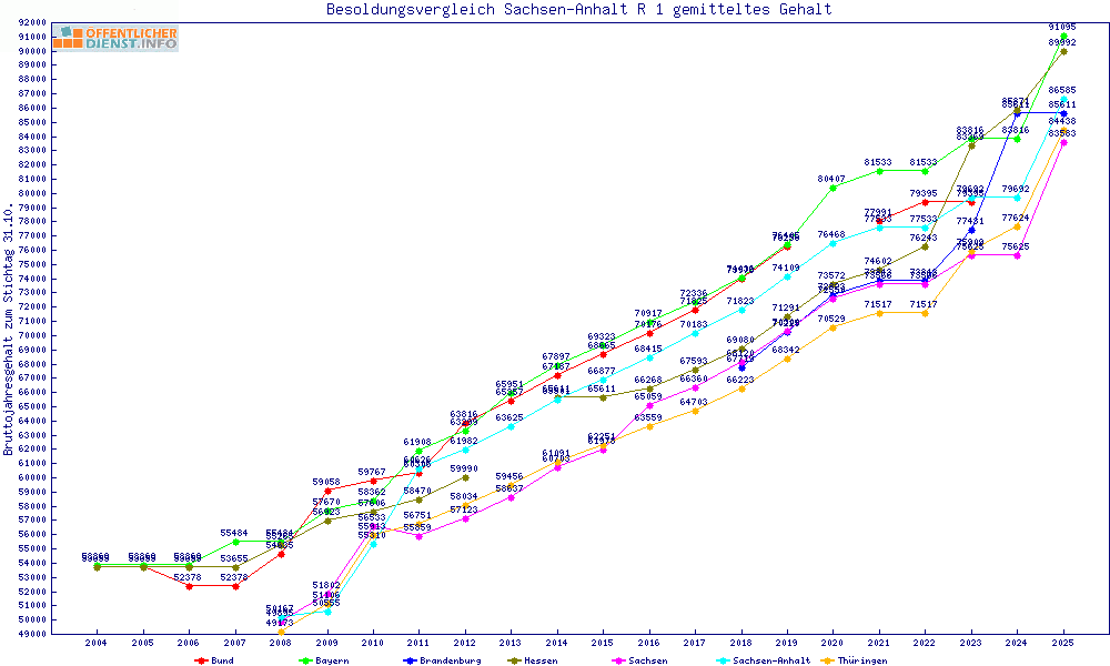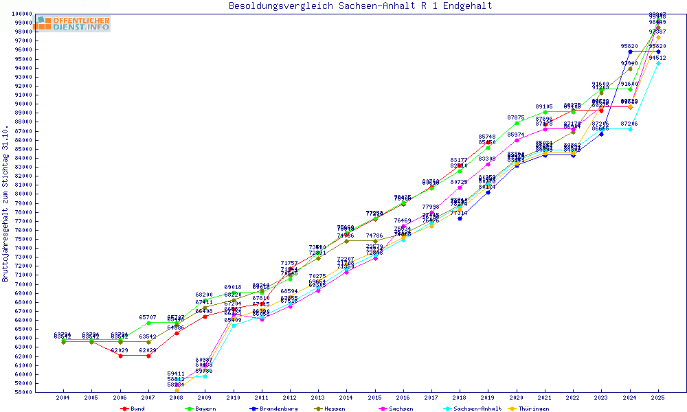 | Sachsen | 99.049 € | +4536 € | +4.8% | +3618 € | +3.8% | 31 Jahre | ||