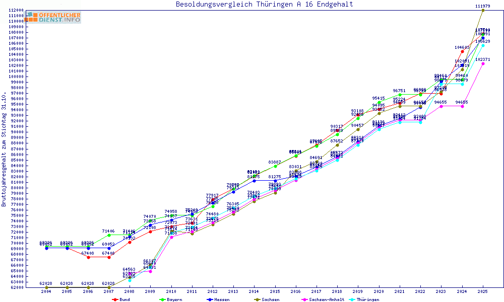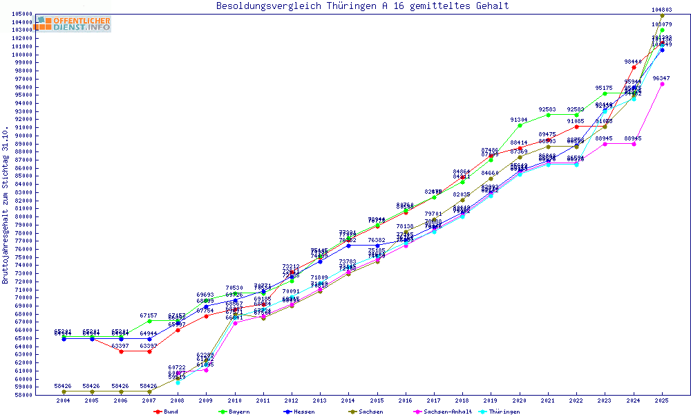 | Thüringen | 105.629 € | +1709 € | +1.6% | 18 Jahre | ||||
