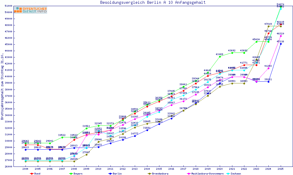 | Besoldungsvergleich A 10 im Jahr 2025 | Anfangsgehalt | ||||||