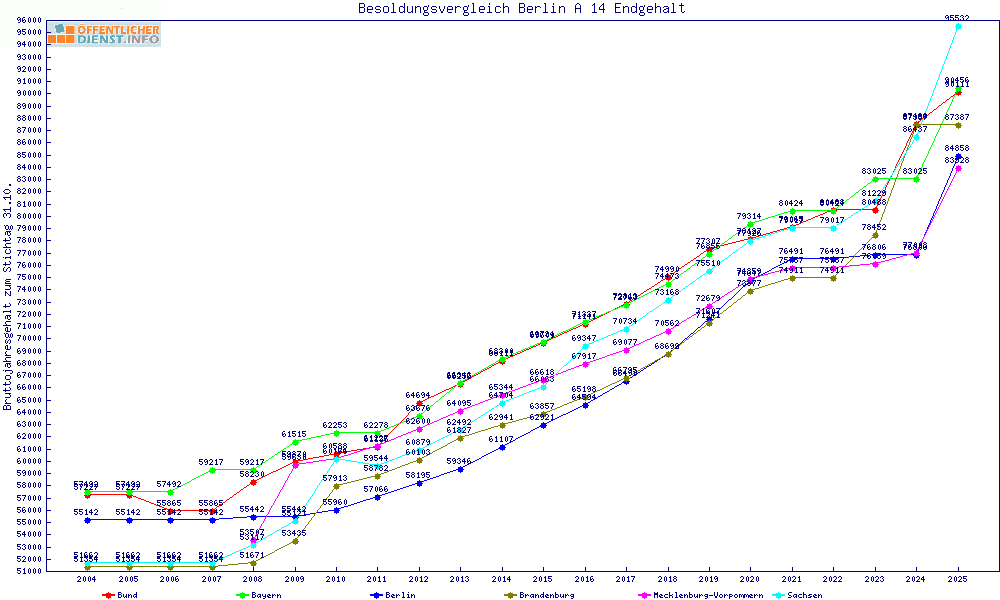 | Bund | 90.112 € | +5253 € | +6.2% | +3524 € | +4.1% | 23 Jahre | ||