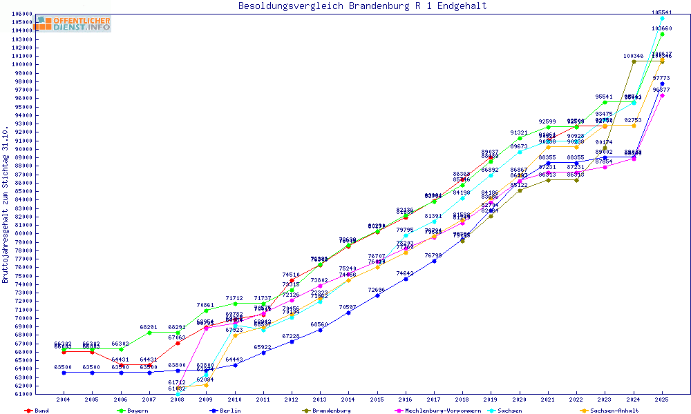 | Sachsen | 105.542 € | +5195 € | +5.2% | +6651 € | +6.7% | 31 Jahre | ||