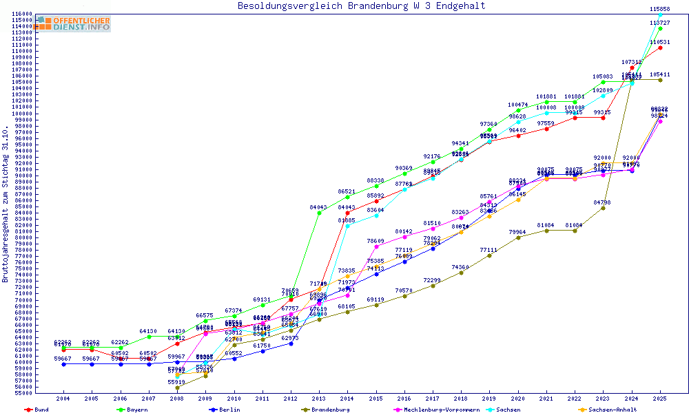 | Sachsen | 115.858 € | +10446 € | +9.9% | +15016 € | +14.9% | 6 Jahre | ||