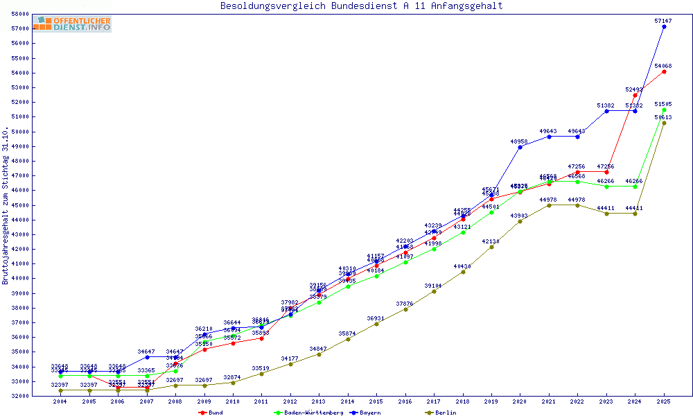 | Besoldungsvergleich A 11 im Jahr 2025 | Anfangsgehalt | ||||||