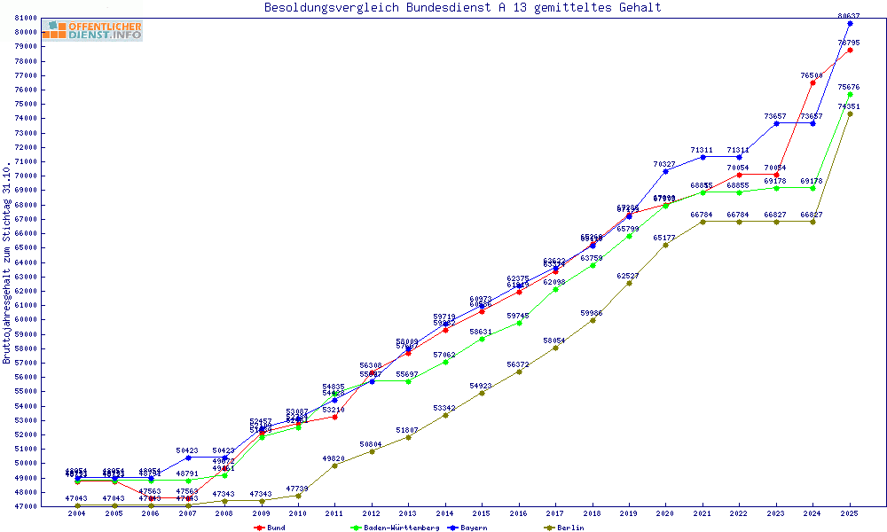 | Besoldungsvergleich A 13 im Jahr 2025 | gemitteltes Gehalt | ||||||