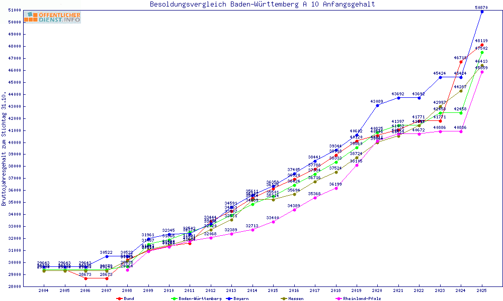 | Besoldungsvergleich A 10 im Jahr 2025 | Anfangsgehalt | ||||||