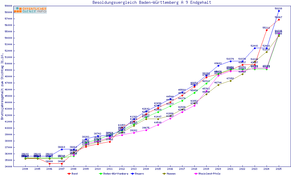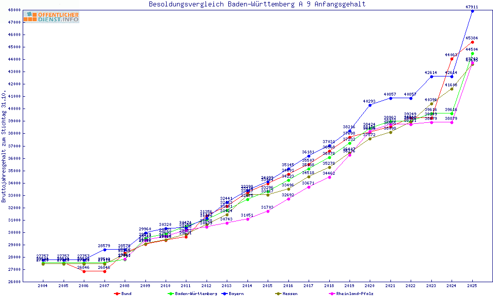 | Besoldungsvergleich A 9 im Jahr 2025 | Anfangsgehalt | ||||||