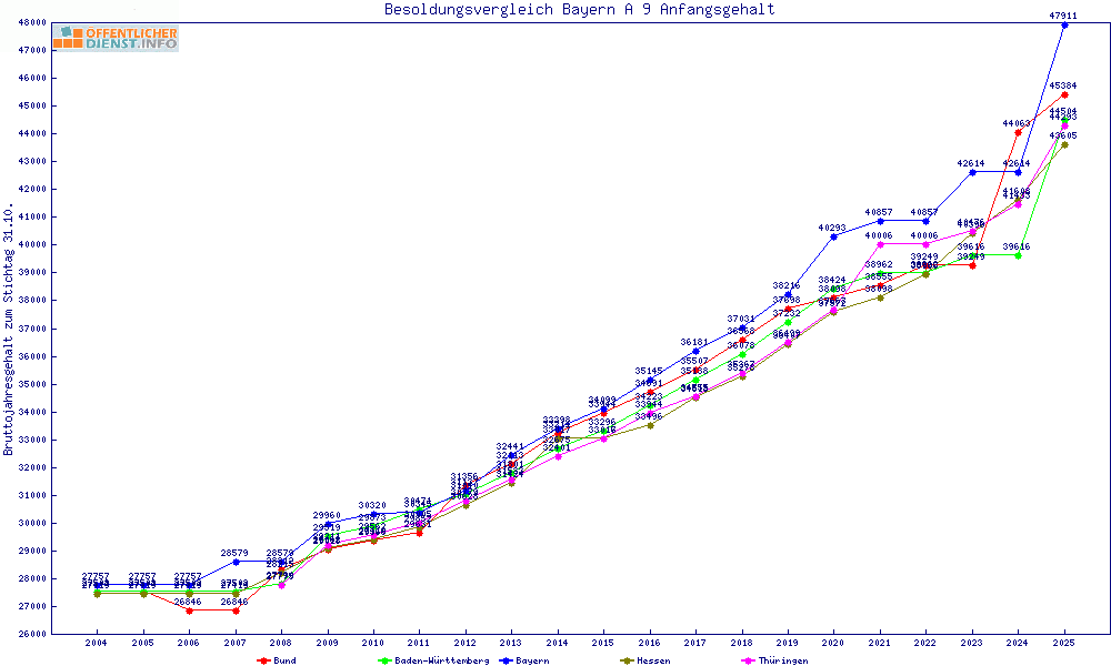 | Besoldungsvergleich A 9 im Jahr 2025 | Anfangsgehalt | ||||||