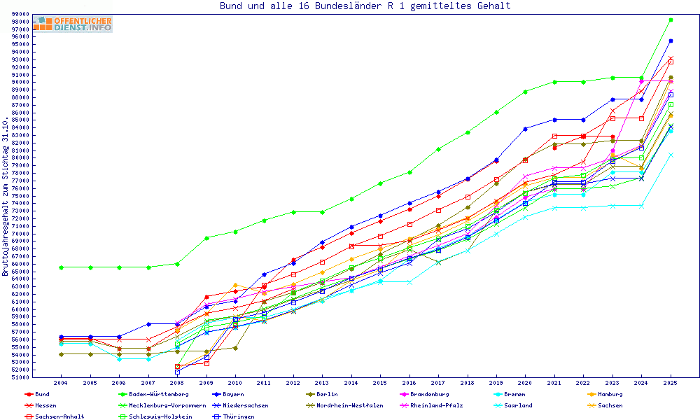 | Besoldungsvergleich R 1 im Jahr 2025 | gemitteltes Gehalt | ||||||