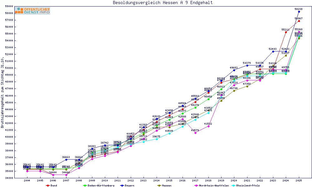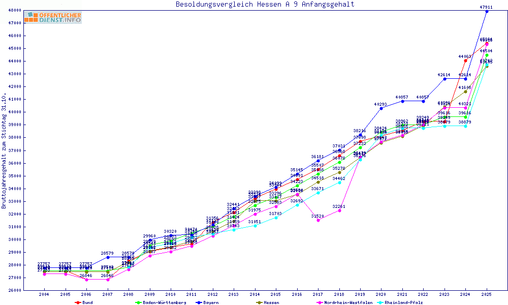 | Besoldungsvergleich A 9 im Jahr 2025 | Anfangsgehalt | ||||||