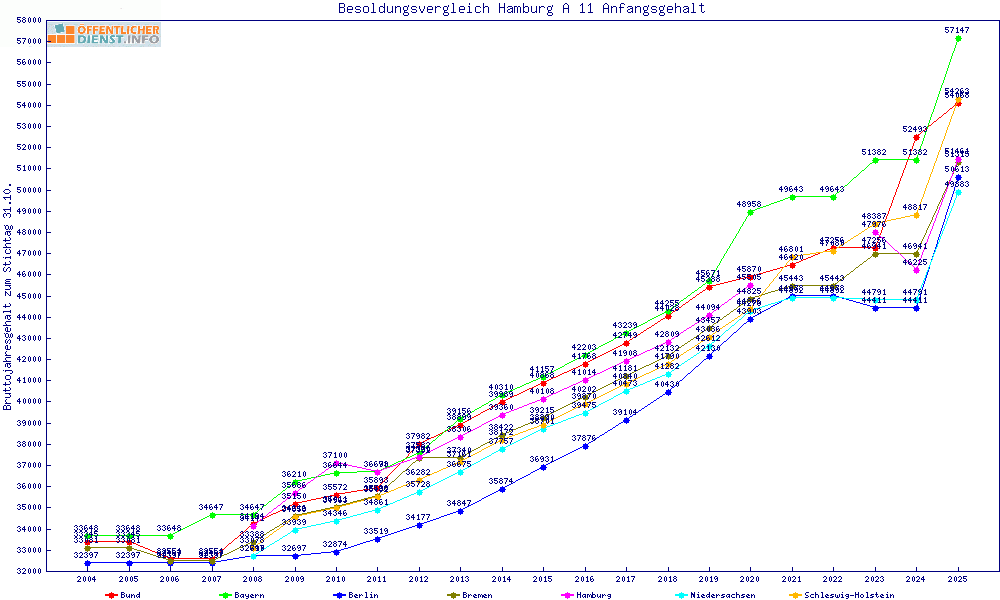 | Besoldungsvergleich A 11 im Jahr 2025 | Anfangsgehalt | ||||||