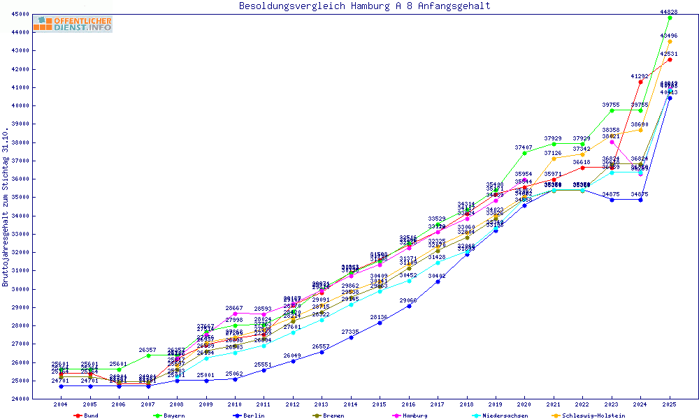 | Besoldungsvergleich A 8 im Jahr 2025 | Anfangsgehalt | ||||||