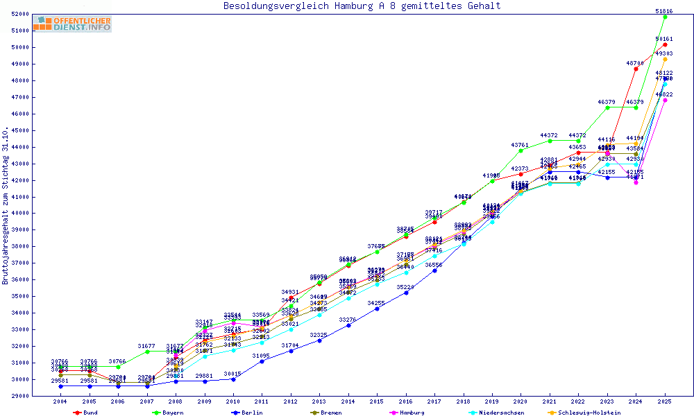 | Besoldungsvergleich A 8 im Jahr 2025 | gemitteltes Gehalt | ||||||