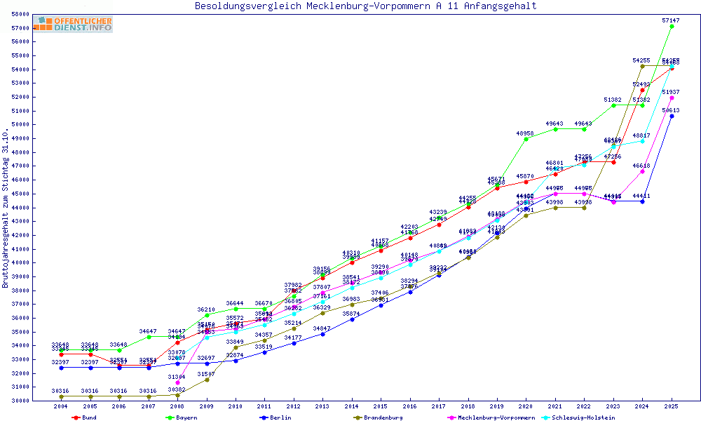 | Besoldungsvergleich A 11 im Jahr 2025 | Anfangsgehalt | ||||||