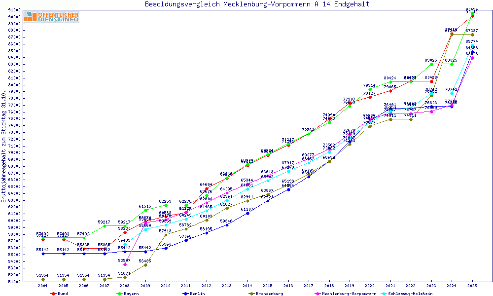 | Bund | 90.112 € | +6183 € | +7.4% | +3524 € | +4.1% | 23 Jahre | ||