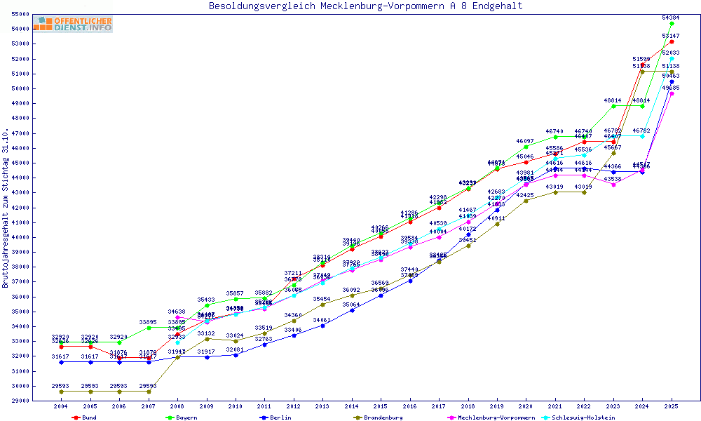 | Mecklenburg-Vorpommern | 49.685 € | -1983 € | -3.8% | 26 Jahre | ||||