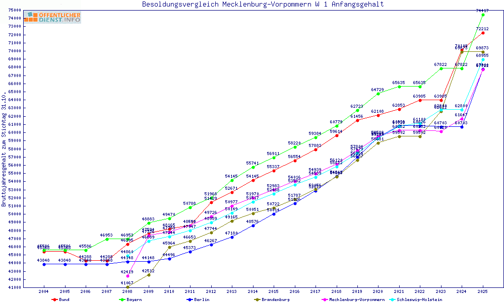 | Besoldungsvergleich W 1 im Jahr 2025 | gemitteltes Gehalt | ||||||