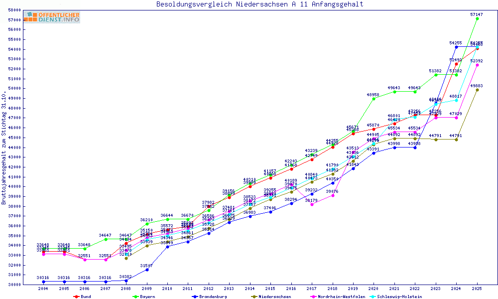 | Besoldungsvergleich A 11 im Jahr 2025 | Anfangsgehalt | ||||||