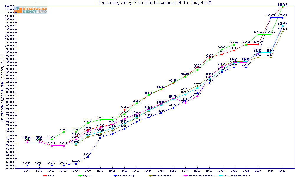 | Bund | 111.668 € | +7297 € | +7.0% | +4260 € | +4.0% | 23 Jahre | ||