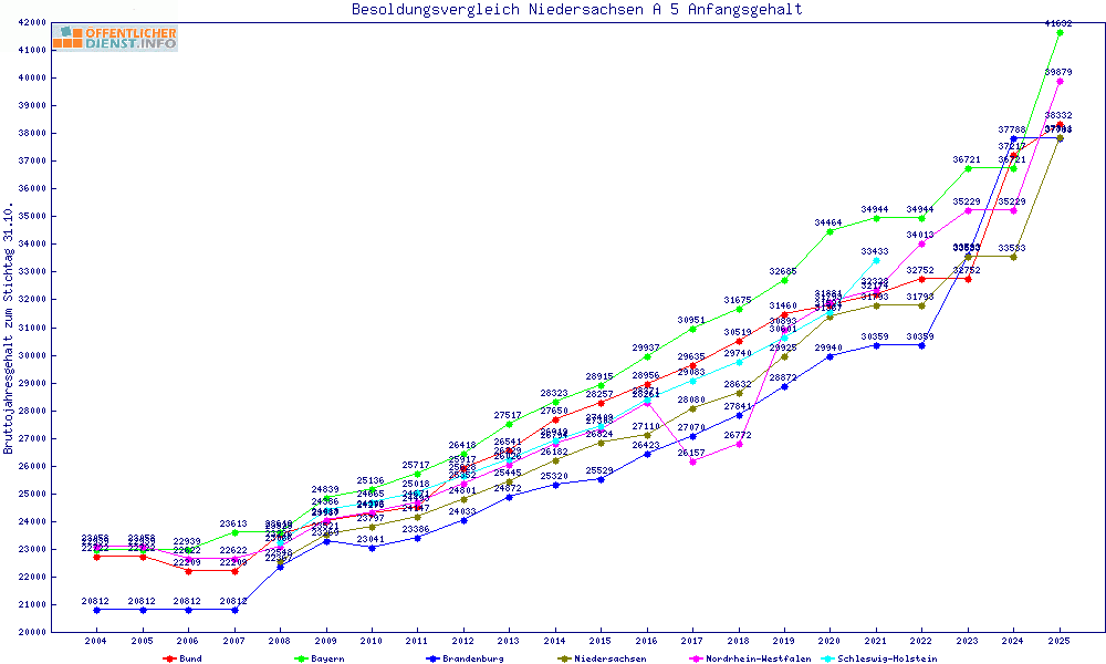 | Besoldungsvergleich A 5 im Jahr 2025 | Anfangsgehalt | ||||||