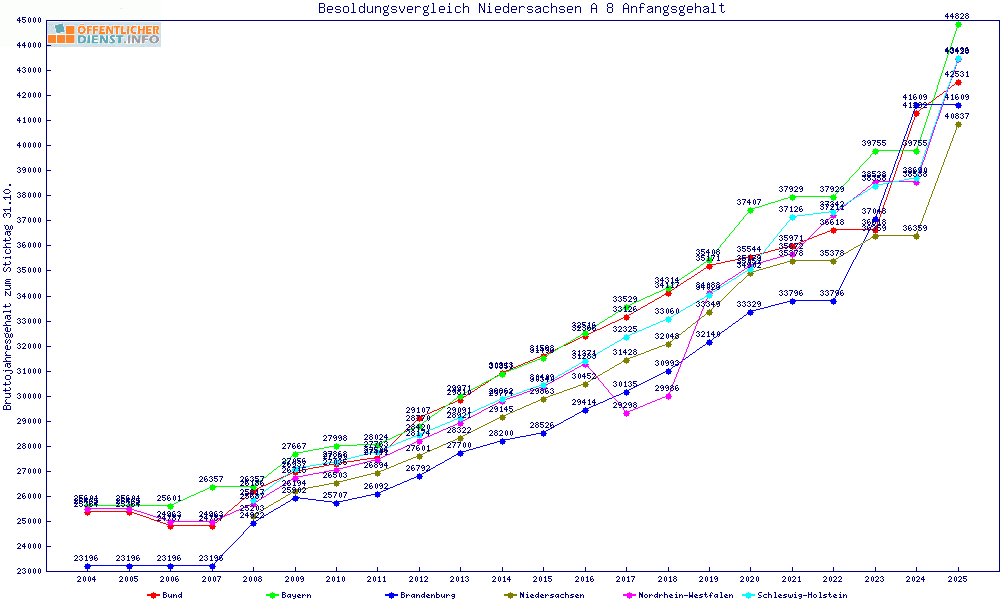 | Besoldungsvergleich A 8 im Jahr 2025 | Anfangsgehalt | ||||||