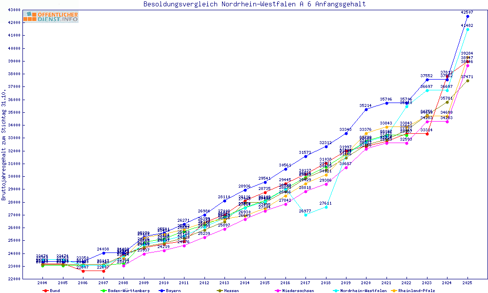 | Nordrhein-Westfalen | 47.625 € | +1973 € | +4.3% | 20 Jahre | ||||
