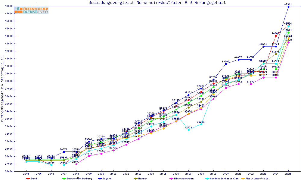 | Besoldungsvergleich A 9 im Jahr 2025 | Anfangsgehalt | ||||||