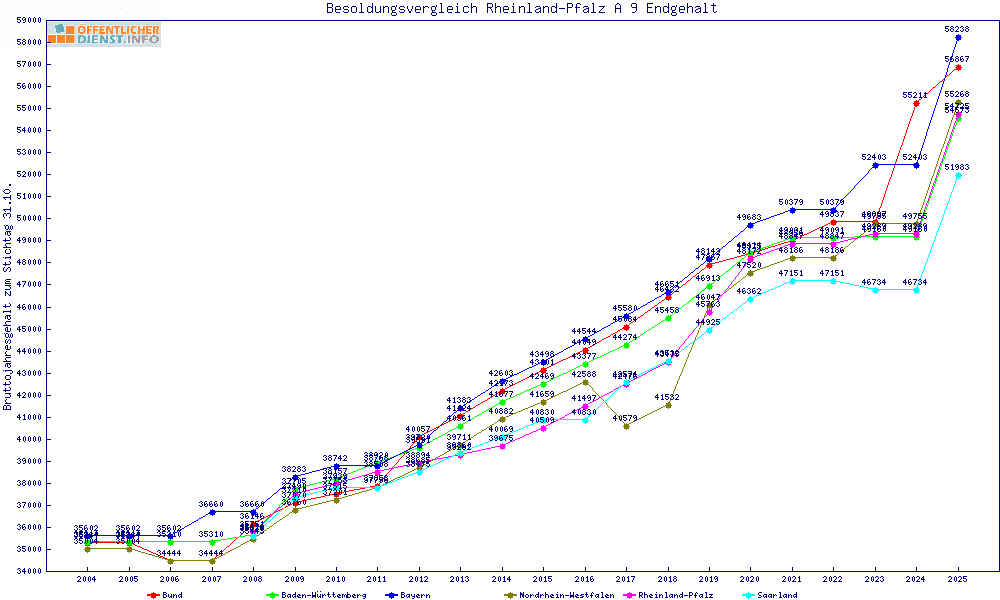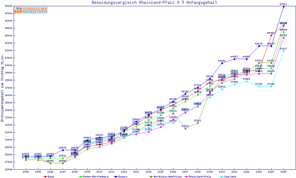 | Besoldungsvergleich A 9 im Jahr 2025 | Anfangsgehalt | ||||||