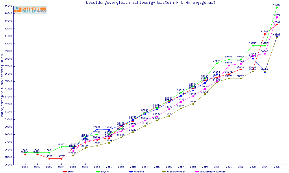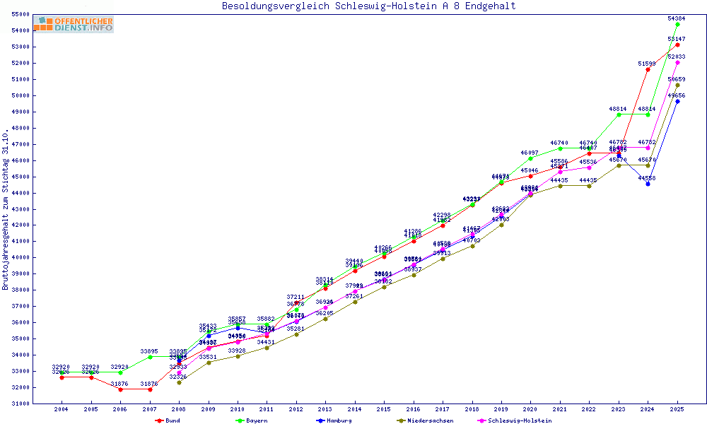 | Schleswig-Holstein | 52.034 € | +365 € | +0.7% | 26 Jahre | ||||